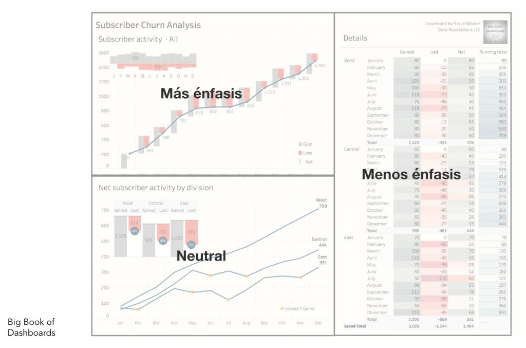 Aparte de los cuadros de mando con datos y métricas, debe aparecer un gráfico limpio y ordenado, que permita entender la evolución de las KPIs solo con un vistazo, de forma intuitiva y clara.