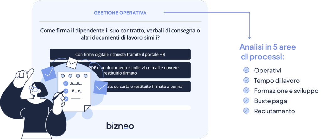 Lo strumento ti proporrà una serie di domande con tre possibili scenari di risposta. L’approccio si basa sui processi più comuni che le aziende adottano per gestire il personale, indipendentemente dalle loro dimensioni o dal numero di collaboratori in organico.