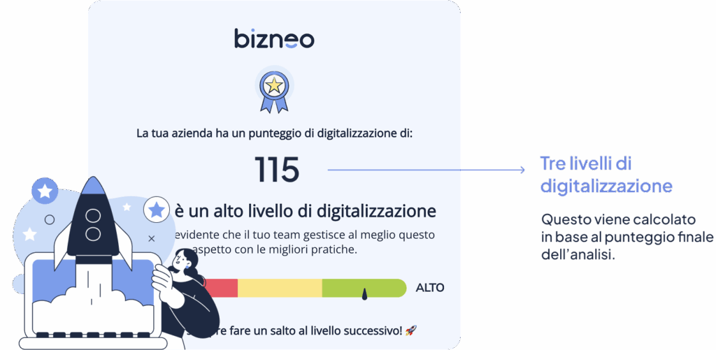Una volta completate le domande, il nostro strumento ti fornirà un punteggio finale che corrisponde a uno dei tre livelli di digitalizzazione. In pochi secondi scoprirai se la tua azienda ha un basso livello di digitalizzazione o, al contrario, è un punto di riferimento da seguire.