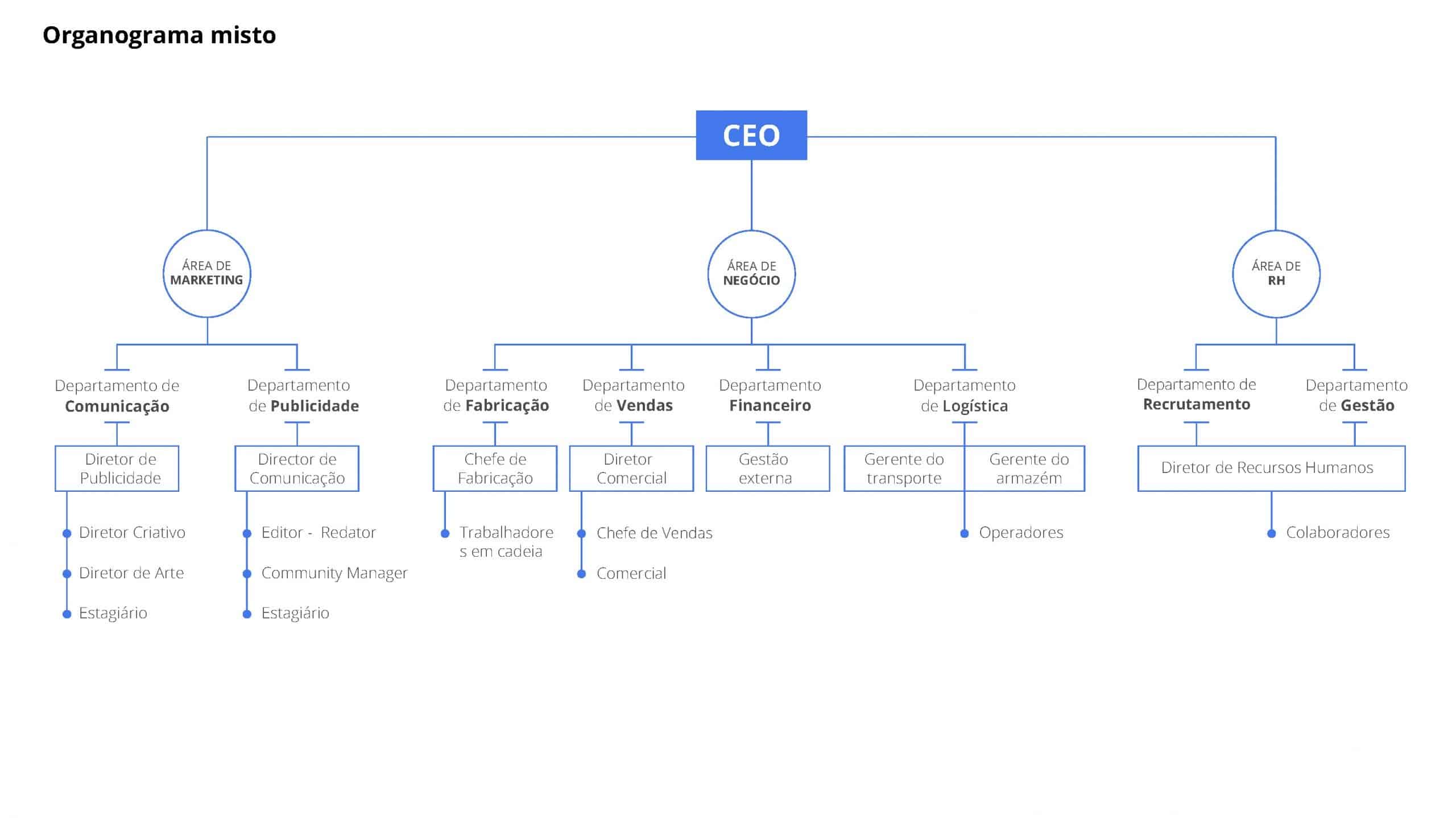 O organograma misto funde o organograma horizontal com o vertical. Partindo de uma área principal e atuando como diretor, as várias áreas são implantadas de cima para baixo e, horizontalmente, os departamentos que a compõem.