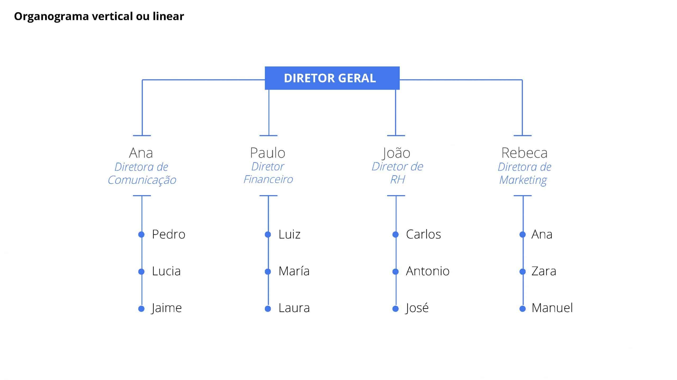 Outro exemplo é o organograma vertical ou também chamado organograma linear que, ao contrário do organograma horizontal, representa a estrutura de cima para baixo, o CEO ou líder hierárquico no topo e subordina o resto das áreas e colaboradores.