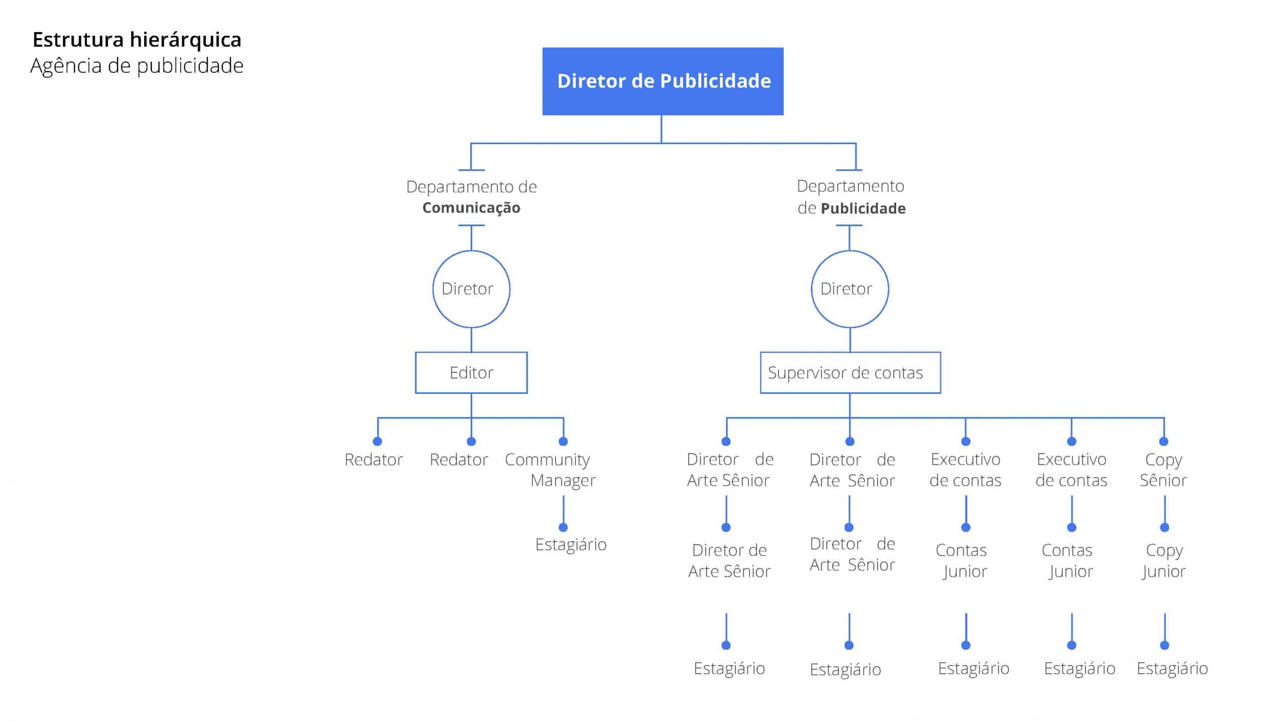 A partir deste ponto de partida, tanto os departamentos como as divisões que os compõem são destacados, sempre submetidos a autoridade mais alta ou à direta da empresa.