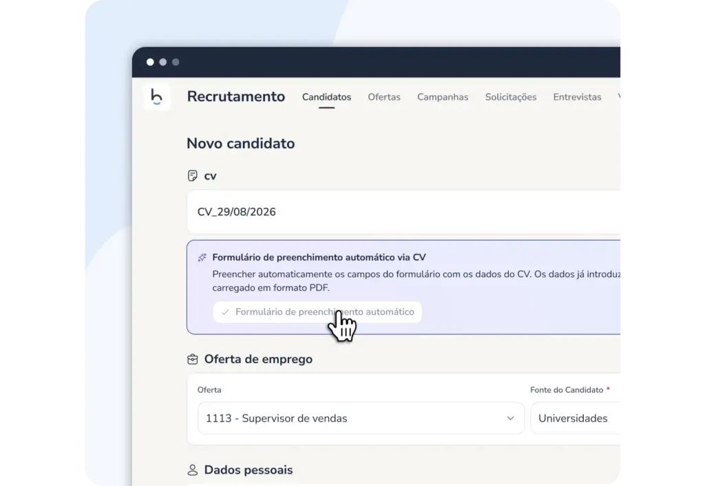O resultado: o recrutador dedica o tempo a entrevistar os três melhores candidatos, não a digitar os dados dos duzentos.